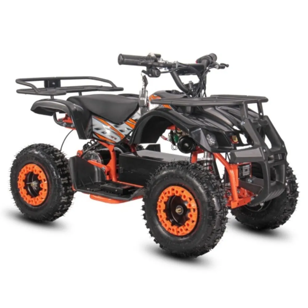 Запаса заряда АКБ хвати на преодоление 25 км пути без подзарядки. Фирменные амортизаторы обеспечивают плавную езду по любому типу дорожного рельефа. Электроквадроцикл оснащен большой светодиодной фарой, разрешающей езду и развлечение подрастающего водителя в вечернее время и непогоду.