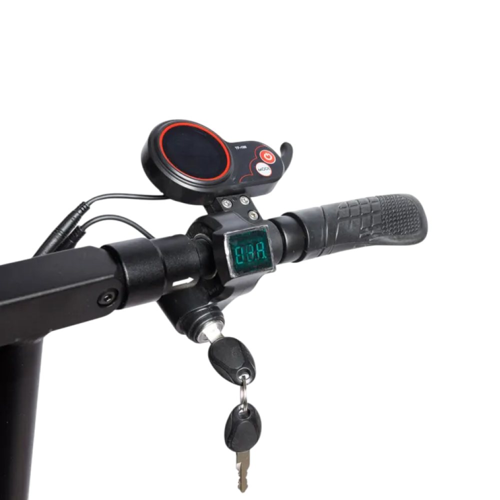 Мощность двигателя 500 Вт, колеса диаметром 10 дюймов, впереди и сзади дисковые тормоза, хорошее сцепление с дорожным покрытием не заносит на повороте. Для комфорта при движении на дальние расстояния можно установить сидение, оно регулируется по высоте, идет в комплекте. Рулевую стойку тоже можно отрегулировать