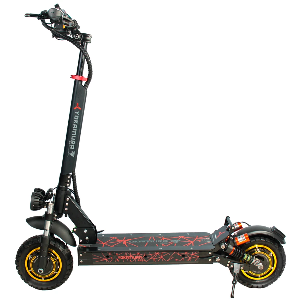Самокат YOKAMURA RX1 на одном заряде аккумулятора преодолевает расстояние 60 км. Дисковая тормозная система на переднем и заднем колесе позволяет совершать маневры, амортизация делает движение электросамоката плавным даже на не ровной дороге. Производитель предусмотрел внешнее освещение для передвижения в темное время суток.