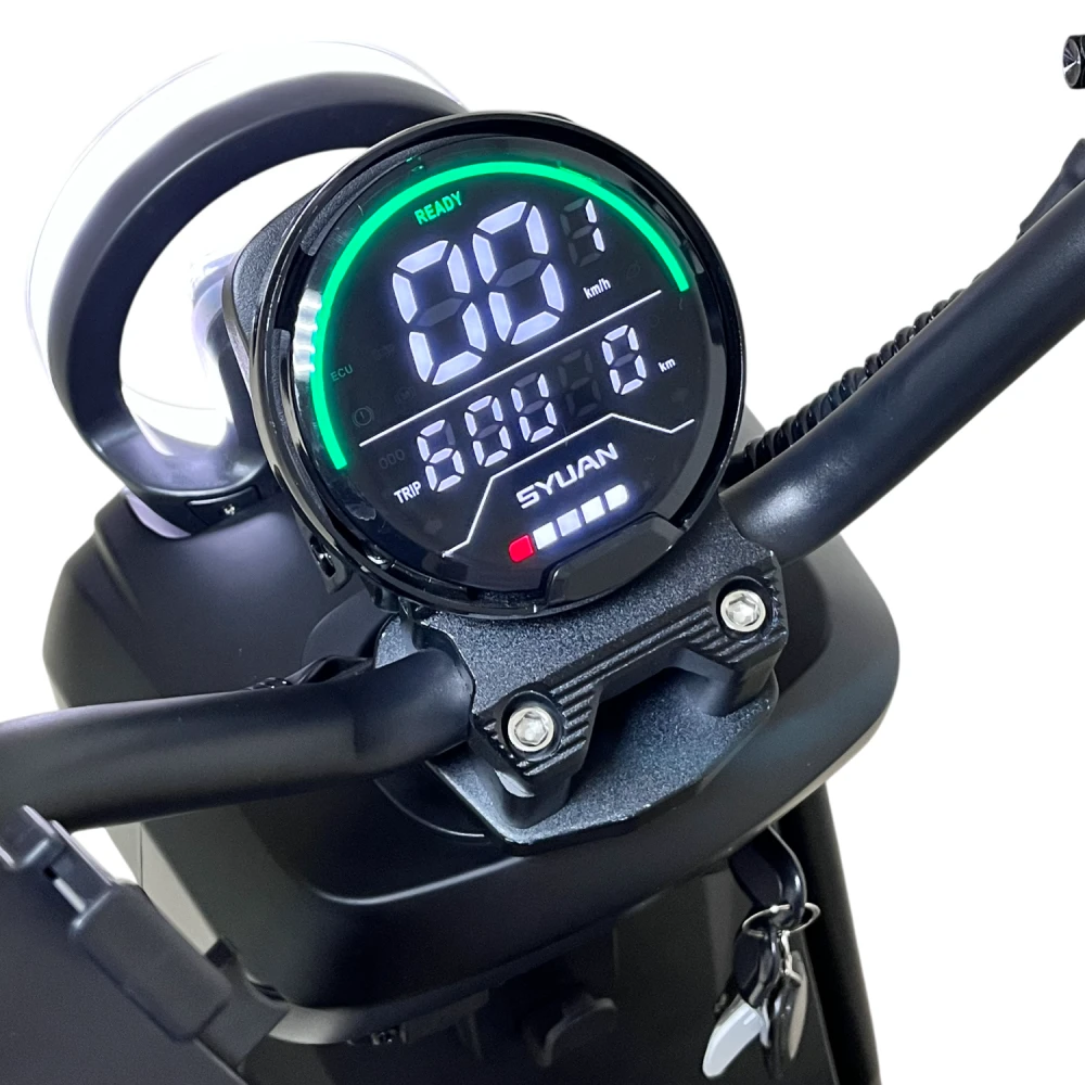 Мощность двигателя 1500 Вт обеспечивает разгон до 60–70 км/ч, справляясь с подъемами до 20° даже при полной нагрузке (150–160 кг), но на неровностях или с пассажиром запас хода падает до 50–70 км. Двухподвесная система (передняя вилка + задние амортизаторы) гасит вибрации на асфальте и гравии; дисковые гидравлические тормоза останавливают за 3–5 м со 50 км/ч; Li-ion аккумулятор 60V 50 Ач с быстрой зарядкой за 8 ч дает реальный пробег 70–100 км в эко-режиме, 50 км в спорте. Три режима езды + задний ход оптимизируют энергоэффективность (эко экономит 20–30% заряда), мотоциклетная ручка газа упрощает контроль; подвеска и задний привод повышают эффективность на 10–15% по сравнению с передним.