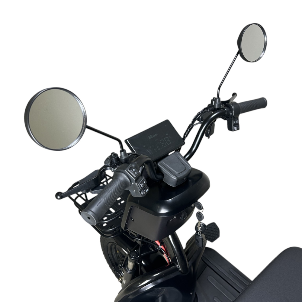 В стандартной комплектации есть зеркала, корзина, фара, стоп-сигналы и поворотники. LCD-дисплей показывает заряд, пробег и скорость, что делает поездки удобнее.