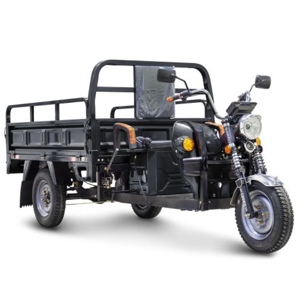 Грузовой электротрицикл Rutrike D4 NEXT 1800 60V1500W в черном цвете — это идеальный транспорт для решения любых логистических задач в городских условиях и за их пределами. Оснащенный мощным электродвигателем мощностью 1500 Вт и аккумулятором высокого напряжения 60V, он способен развивать скорость до 25 км/ч и обеспечивать пробег до 80 км на одном заряде. Его грузоподъемность составляет впечатляющие 1200 кг, что делает его незаменимым помощником в доставке товаров. Конструкция трцикла продумана до мелочей: легкий доступ к грузовому отсеку размером 1720×1120×460 мм, два типа тормозной системы — барабанные тормоза на передних и задних колесах, а также надежная подвеска с гидравлическими амортизаторами, обеспечивающая комфортную езду даже по сложным дорожным условиям. Время зарядки батареи составляет всего 8-10 часов, делая его практичным выбором для всесезонной эксплуатации. Грузовой электротрицикл Rutrike D4 NEXT — это сочетание мощи, надежности и удобства, что делает его идеальным выбором для бизнеса.