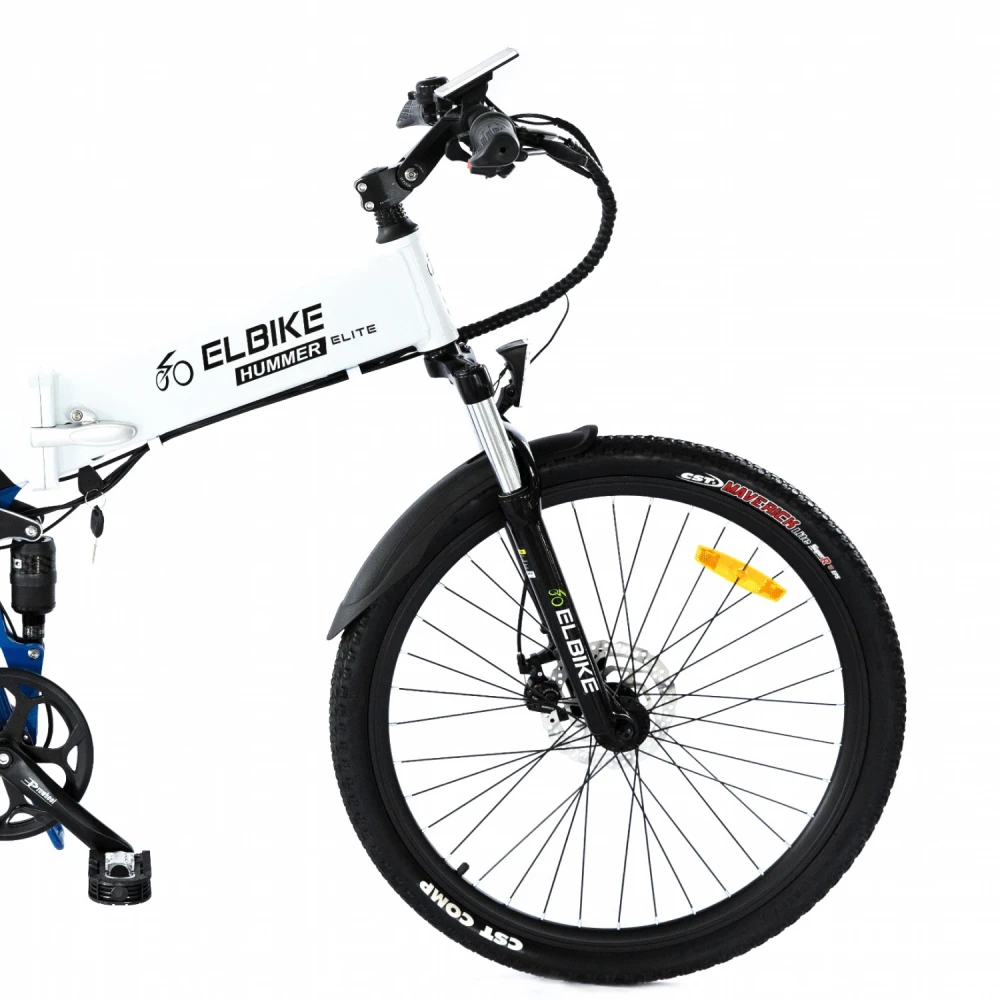 Электровелосипед Elbike HUMMER ELITE 13 Синий – выглядит круто на фоне другой, аналогичной техники. Рама выглядит массивно и современно за счет брендовой надписи и наличия в ней емкой батареи. 26 дюймовые колеса с цепкими покрышками предназначены для езды по бездорожью и другой проблематичной местности. Также техника может использоваться в качестве ежедневного варианта.
