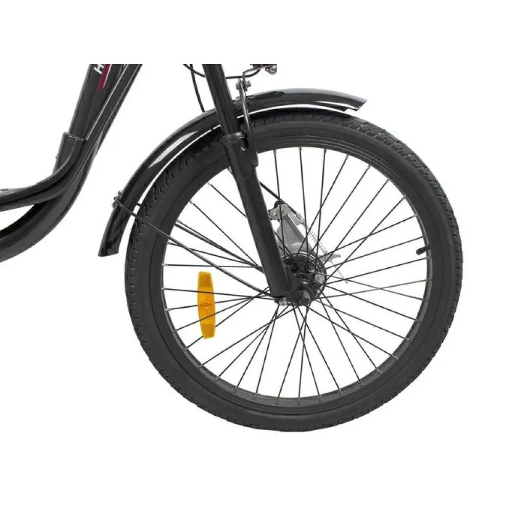 Электровелосипед оснащен бесщеточным электромотором с параметрами мощности 350 Вт. Максимальная скорость разгона составляет 32 км/час. На одной подзарядке батареи максимальный пробег байка составляет 40 км. При подключении смешанного режима пользования байком пробег можно увеличить на порядок. Стальная конструкция рамы – низкая, удобная для невысоких пользователей.