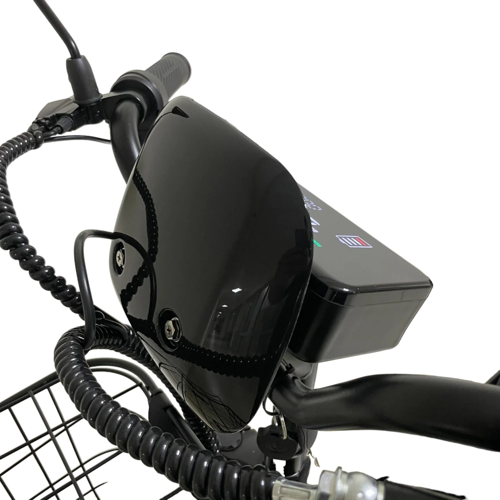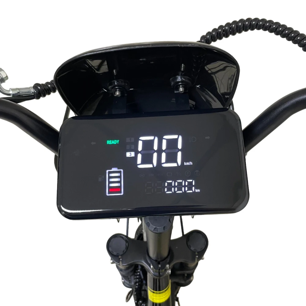 LCD показывает скорость, пробег, заряд и вольтаж — полный контроль поездки одним взглядом.