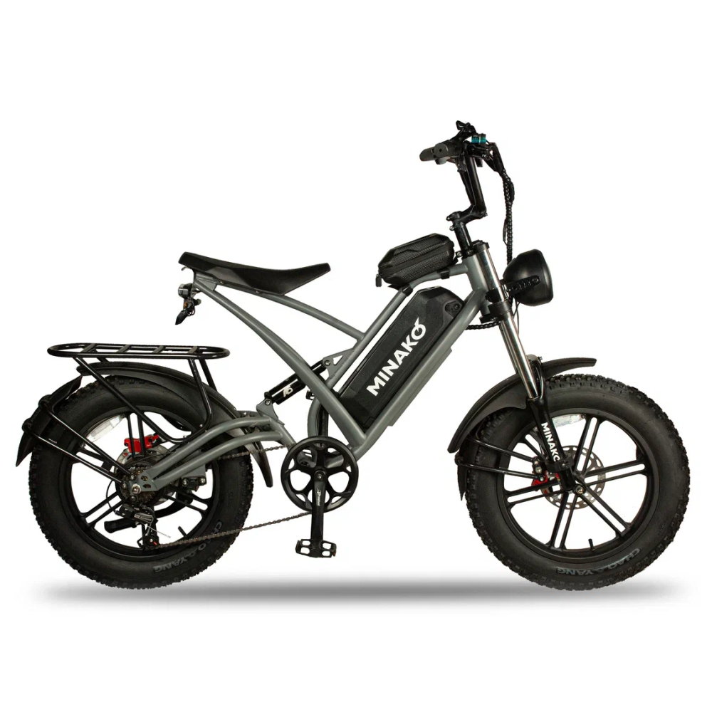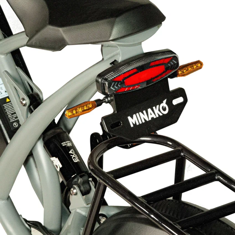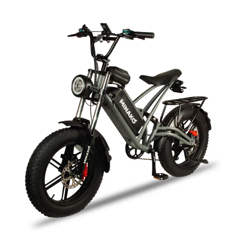 Серебристый электровелосипед Minako FOX (23Ah) - это сила и стиль, воплощённые в металле. С литыми дисками и внедорожными покрышками размером в 20 дюймов, он создан для тех, кто не боится скорости и предпочитает действовать, а не ждать. С максимальной скоростью до 55 км/ч и мощностью в 1000W, Minako FOX позволяет вам наслаждаться свободой движения на расстоянии до 60 км на одном заряде. Дисковые гидравлические тормоза обеспечивают безопасность, а уникальный дизайн, напоминающий питбайк, в сочетании с мотоциклетной вилкой и большой фарой, делают его неповторимым. Велосипед оснащён сумкой и багажником, который можно использовать как сиденье для пассажира. Амортизатор закрытого типа сзади и стоп-сигнал дополняют функционал этого уникального электровелосипеда.