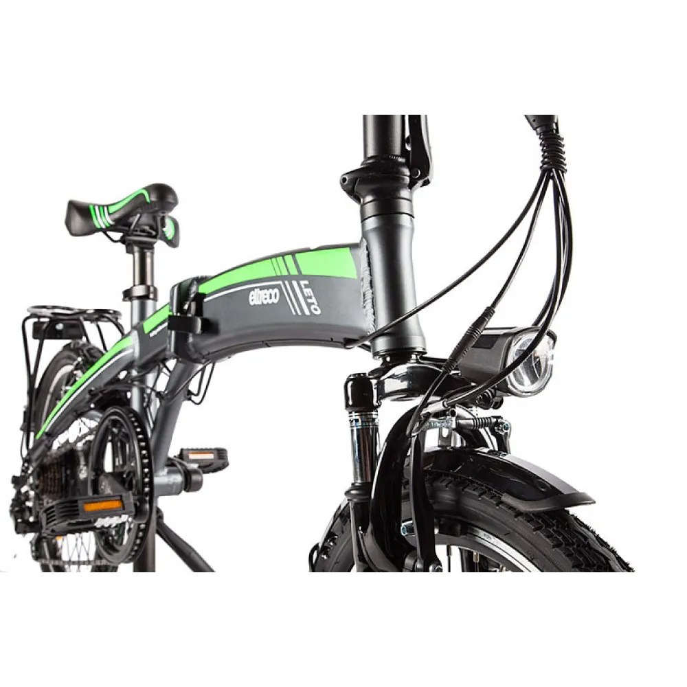 Над задним колесом расположен металлический багажник для надежной фиксации личных вещей. 20-дюймовые колеса повышают маневренность электровелосипеда, а амортизированная подвеска позволяет комфортно преодолевать неровности дороги. Велогибрид Eltreco LETO весит меньше 22 килограммов и имеет складную конструкцию. В сложенном виде данная модель настолько компактна, что без труда поместиться в пассажирском лифте или багажнике автомобиля.