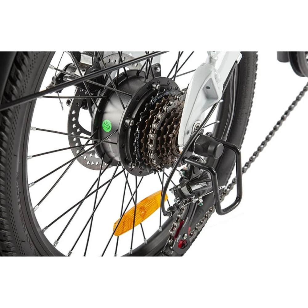Фирменные подвески с усиленной амортизацией позволяют мягко и легко преодолевать дорожные ямы и неровности. Тормозная система состоит из передних и задних гидравлических тормозов для быстрой остановки в любой ситуации. Техника имеет складную конструкцию. Рама изготовлена из прочного облегченного алюминия, имеет отсек для аккумулятора. Широкие крылья на колесах надежно защищают пользователя от брызг и грязи. Вместительный багажник рассчитан на перевозку пассажиров и доставку багажа.